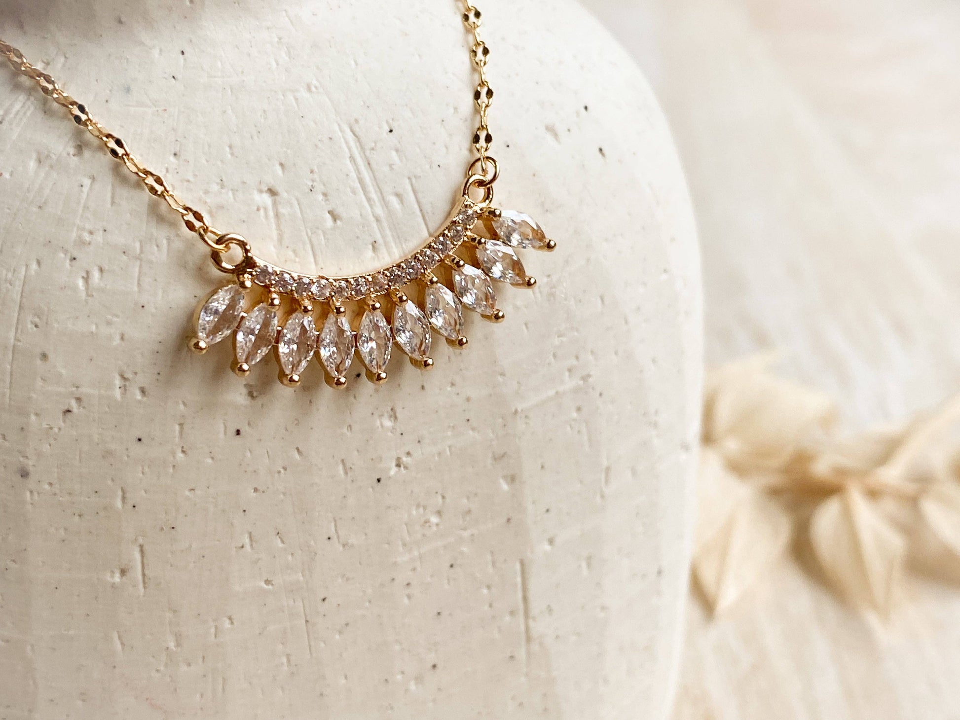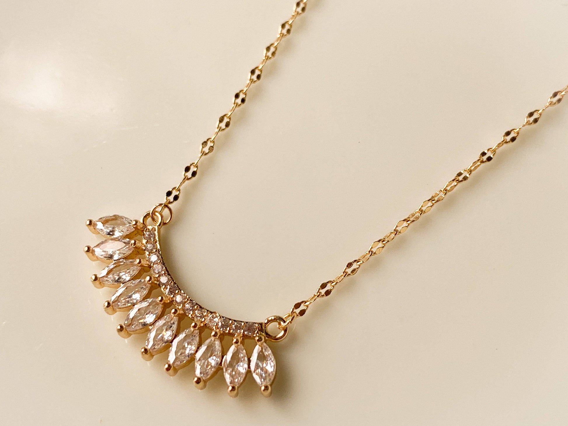 This is as pretty as pretty gets. You looking to dress up or just feel extra? Put this beauty on your neck or gift it to someone special and make their day! This 18K Gold plated chain is so sparkly and the pendant is full of marquise Cubic Zirconia stones. 18" in length.