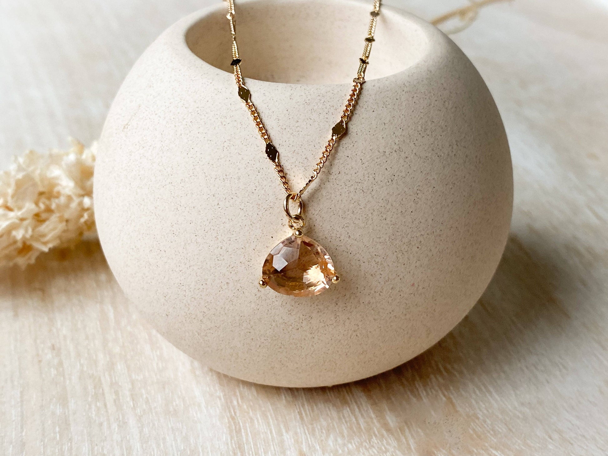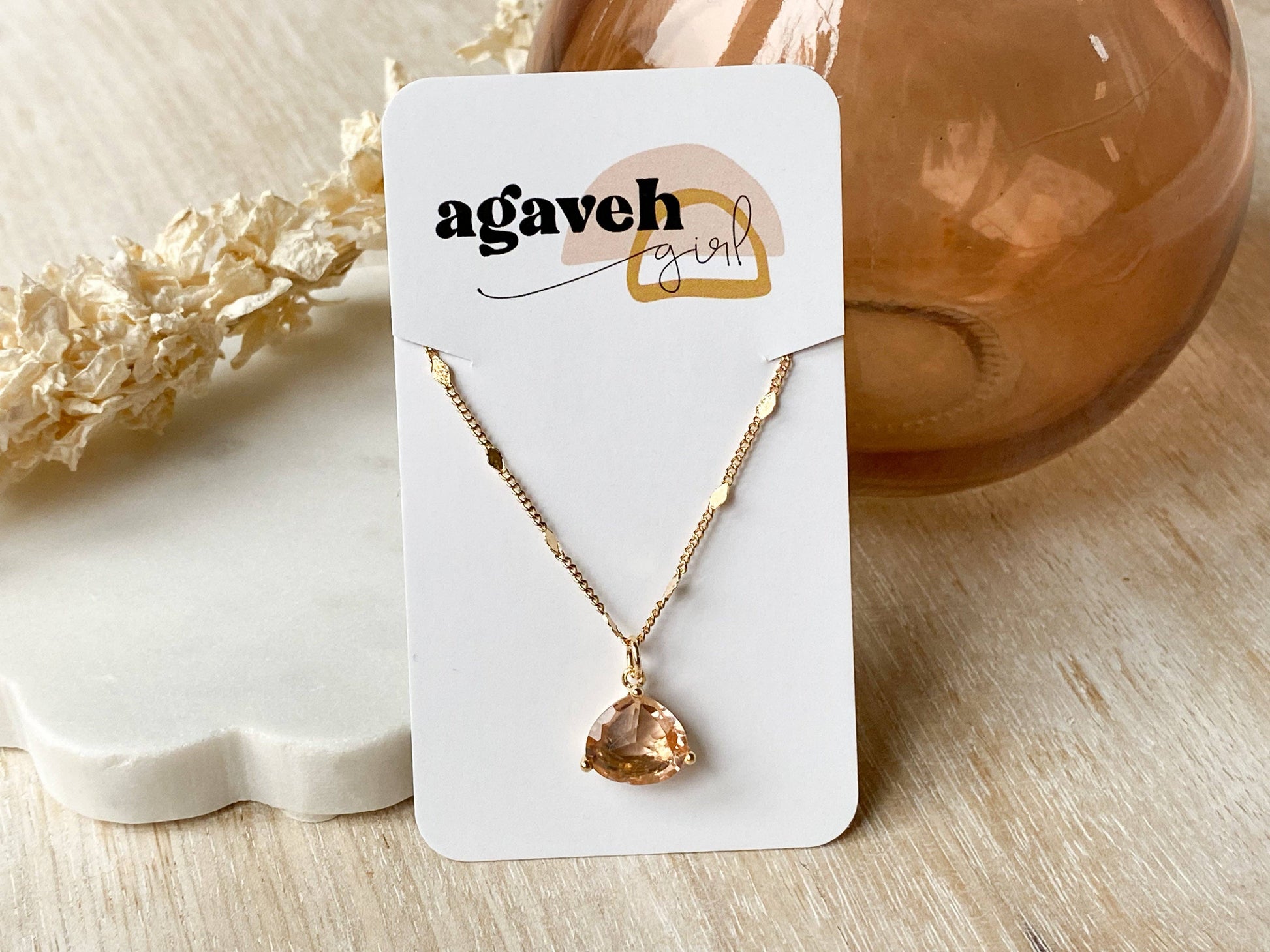 A beautiful gold necklace with a peach glass teardrop pendant. This necklace is 18" in length, is gold plated, and tarnish resistant which means you can get it wet with no problems!